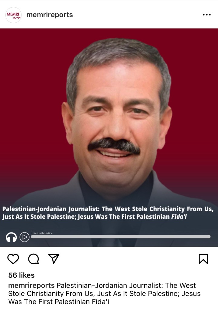 Rashida Tlaib quoted Rev. Prof. Mitri Raheb, pastor of the Evangelical Lutheran Christmas Church in Bethlehem, who speaks of the Christmas story as of a Palestinian story par excellence, equates Roman colonial power with the Jewish State and the Gazans fleeing from the north to the south with Mary and Joseph being ordered to evacuate from the north to the south (which they weren’t – they were simply moving south because of a census, but not being ordered to evacuate or flee because of a war that their government had started).