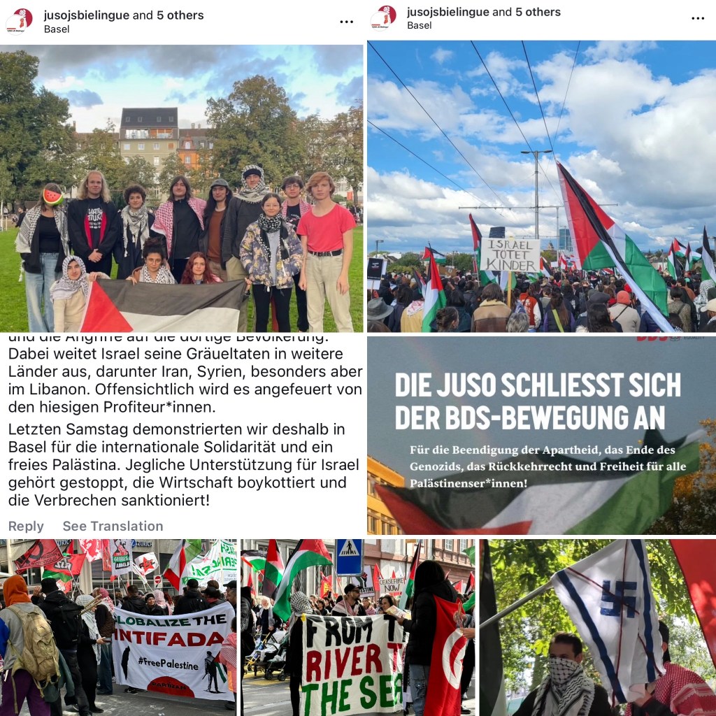 So waren sich die Jusos auch nicht zu schade, bei der Palästina-Demo in Basel mitzulaufen: eine Demo, die sich zwar Friedensdemo nannte, aber bei der Gewalt, Terror, und Auslöschungsfantasien verkündet bzw. gefordert wurden; eine Demo, an der die Märtyrer gepriesen wurden; eine Demo, wegen deren ein Grossteil der jüdischen Bevölkerung und Institutionen geschützt werden musste bzw. verängstigt zu Hause blieb ob des Hasses und der Gewaltbereitschaft gewisser Teilnehmer.