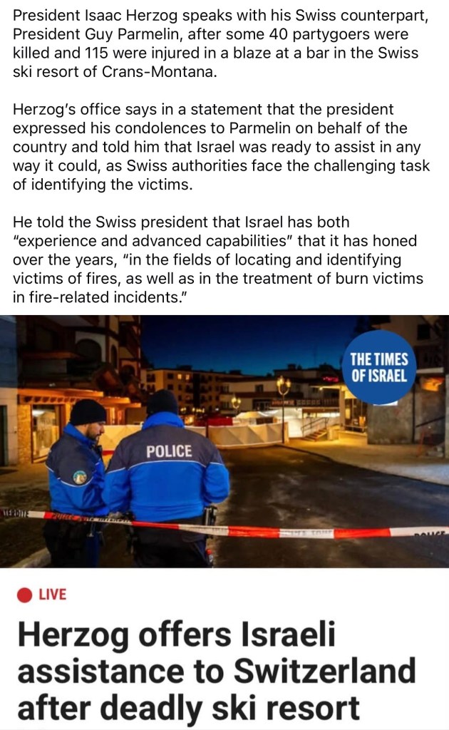 Nach der Tragödie nahm der israelische Staatspräsident Isaac Herzog Kontakt mit dem Schweizer Bundespräsidenten Guy Parmelin auf. Er sprach sein Beileid aus und bot den Schweizer Behörden Unterstützung an. Israel verfüge, so Herzog, über langjährige Erfahrung und spezialisierte Fähigkeiten bei der Identifizierung von Brandopfern sowie in der Behandlung von Brandverletzungen – Kompetenzen, die sich aus der Bewältigung zahlreicher Notfälle und Katastrophen ergeben haben.
