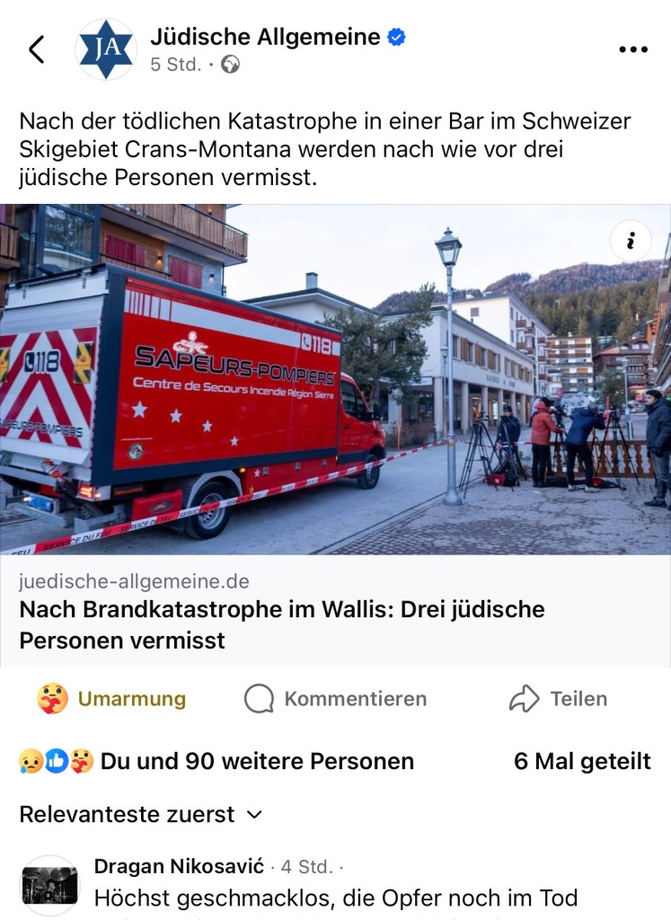 In der Berichterstattung wurde außerdem erwähnt, dass sich im selben Gebäudekomplex ein Chabad-Gebetshaus befindet und dass unter den Vermissten auch drei jüdische Menschen sind. Das ist eine sachliche Information – nicht mehr und nicht weniger. Jede Zeitung berichtet aus ihrer jeweiligen Perspektive: Eine schweizerische Zeitung über Schweizerinnen und Schweizer, eine spanische über spanische Staatsbürger, eine jüdische Zeitung über jüdische Menschen. Das schmälert weder das Leid anderer noch setzt es irgendein Leben über ein anderes.