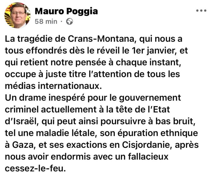 In seinem Kommentar bezeichnet Mauro Poggia die Tragödie von Crans-Montana als einen „glücklichen Umstand“ für die israelische Regierung, die dadurch angeblich ungestört eine „ethnische Säuberung“ fortsetzen könne. Israel wird als „tödliche Krankheit“ beschrieben, als grundsätzlich verbrecherisch.