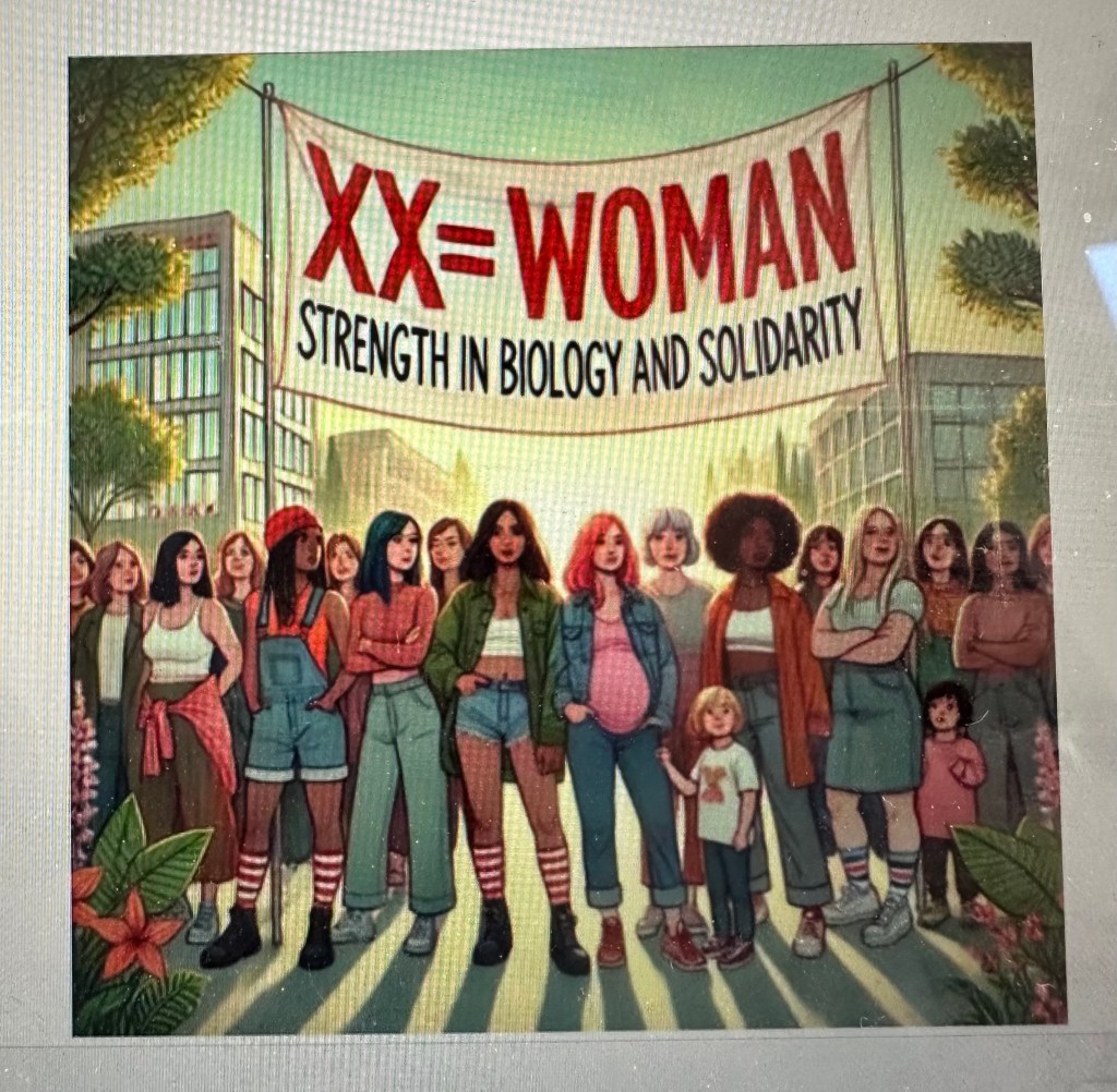 Dieses Bild negiert explizit Menschen, deren Chromosomen nicht eindeutig XX sind. Intergeschlechtliche Frauen – etwa solche mit XXY, XX/XY-Mosaik oder anderen Variationen – werden hier schlichtweg aus dem normativen Raster ausgeschlossen. Ihre Existenz, ihre Identität und ihre Körper werden unsichtbar gemacht, weil sie nicht in die enge biologistische Definition von „Frau“ passen. Dabei sind intergeschlechtliche Menschen genauso Frauen, mit ihrer eigenen körperlichen Realität, ihrer eigenen Geschichte und ihren eigenen sozialen Erfahrungen. Indem das Bild sie unsichtbar macht, reproduziert es biologischen Determinismus und strukturelle Gewalt: Es sagt implizit, dass die Würde einer Frau an einen bestimmten Chromosomensatz gebunden ist – und dass Abweichungen von der Norm illegitim sind. Das ist nicht nur feindlich, sondern existenzgefährdend, weil es die Realität intergeschlechtlicher Menschen auf ideologische Weise verleugnet.