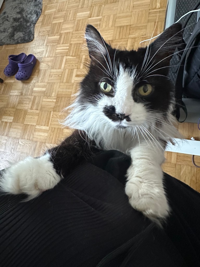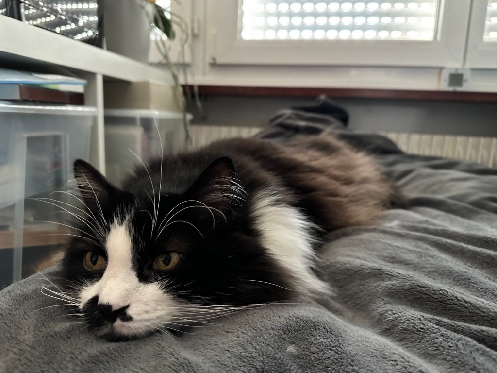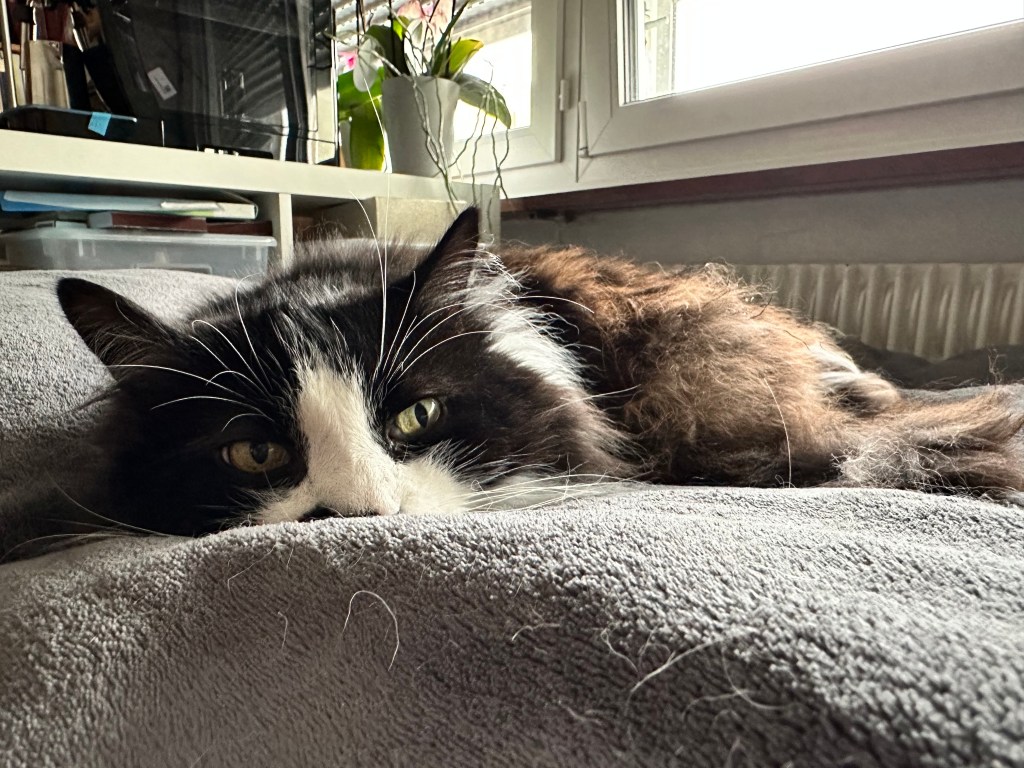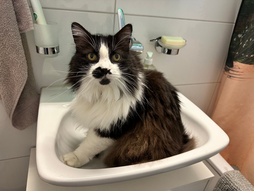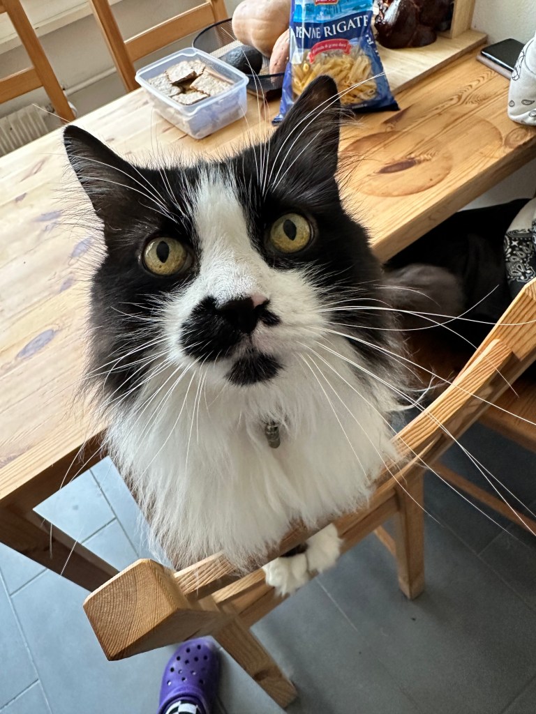 Und dann meine kleinen Streiche: die wilden fünf Minuten, durch die Wohnung rasen, kurz an der Wand stehen, gucken, als würde ich sagen „Ha! Habt ihr das gesehen?“ – und weiter, schneller, wilder, frecher. Mein Stuhl war mein Thron, mein Essensplatz mein Königreich. Ich habe euch deutlich gemacht: „Hier sitze ich, hier bekomme ich meinen Anteil!“ Mit Pfotenklopfen, mit Blick, mit Miauen – immer höflich, aber bestimmt.