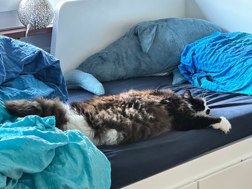 Ich habe meinen Platz gefunden: mein Lieblingsstuhl, meine kuscheligen Ecken, mein Bett (meistens auf dem Kopfkissen, versteht sich). Ich habe euch gezeigt, wie man elegant die Nudeln vom Teller angelt oder die Brokkoli-Vorräte plündert. Thunfischmus, Fastfood – oh ja, das hat mich sofort um den Finger gewickelt! Ich war ein Feinschmecker, kein Kostverächter.